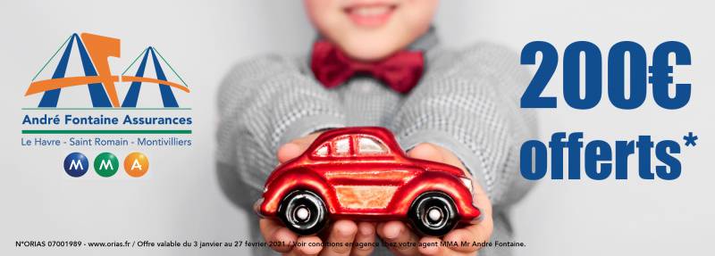 * Pour toute souscription auprès d’un Agent MMA d’un premier contrat Auto (CG 614) ou Habitation (CG 410), MMA déduit 200 euros de la cotisation annuelle de votre 2ème contrat (CG 614 ou CG 410, hors Mobil-home, châteaux et biens assimilés) souscrit (Auto si Habitation ou Habitation si Auto), lorsqu’elle est supérieure ou égale à 201 euros (hors paiement trimestriel et semestriel). Offre non cumulable, non renouvelable, valable du 2 janvier au 27 février 2021 et uniquement la première année de souscription.